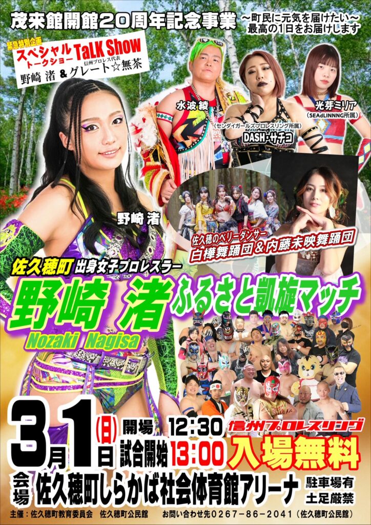 03/01(日) 野崎渚ふるさと凱旋マッチ 最終更新日時 : 信州プロレスリング 【日程】2026年03月01日(日)【時間】13:00開始(12:30開場)【会場】南佐久郡佐久穂町・しらかば社会体育館 佐久穂町出身の野崎渚選手凱旋マッチに信州プロレスも参加いたします。 アクセス \ 最新情報をチェック / FacebookXBlueskyHatenaCopy
