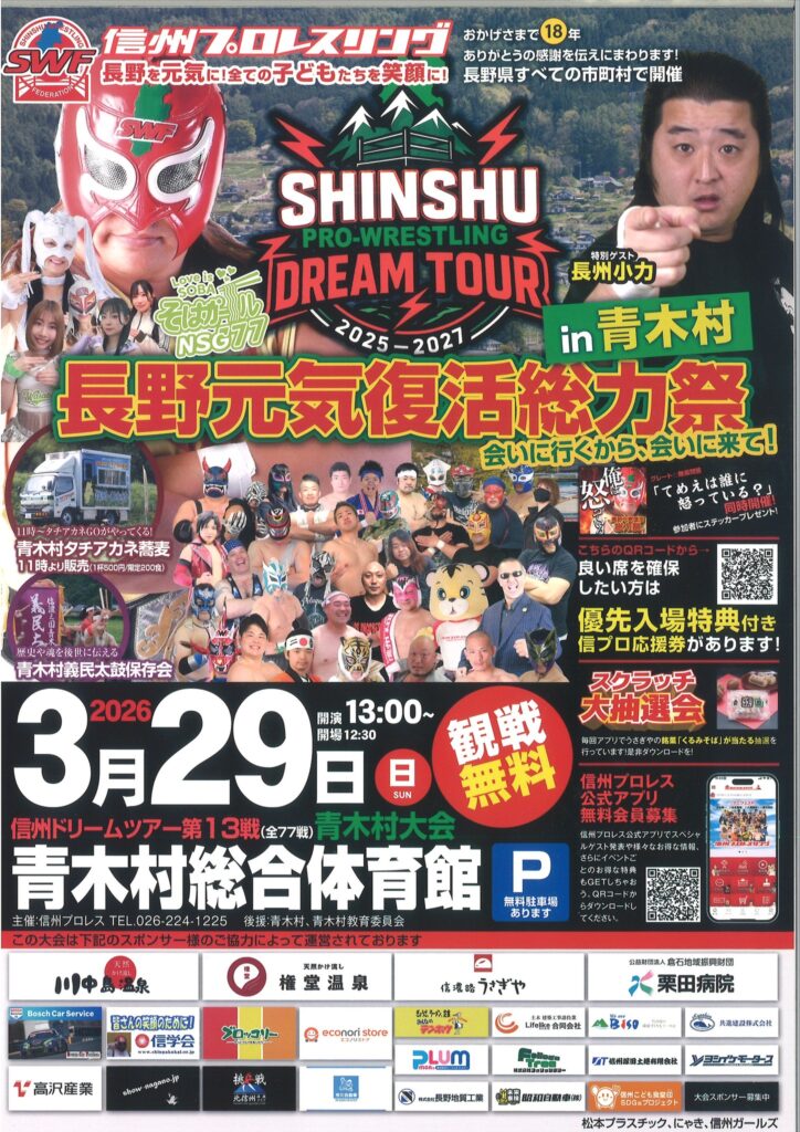 77市町村ドリームツアーin青木村 最終更新日時 : 信州プロレスリング 【日程】2026年03月29日(日)【時間】未定【会場】青木村・某所 県内全77市町村を巡る「長野県77市町村ドリームツアー2025-2027~元気復活総力祭~」の一つです。 アクセス FacebookXBlueskyHatenaCopy