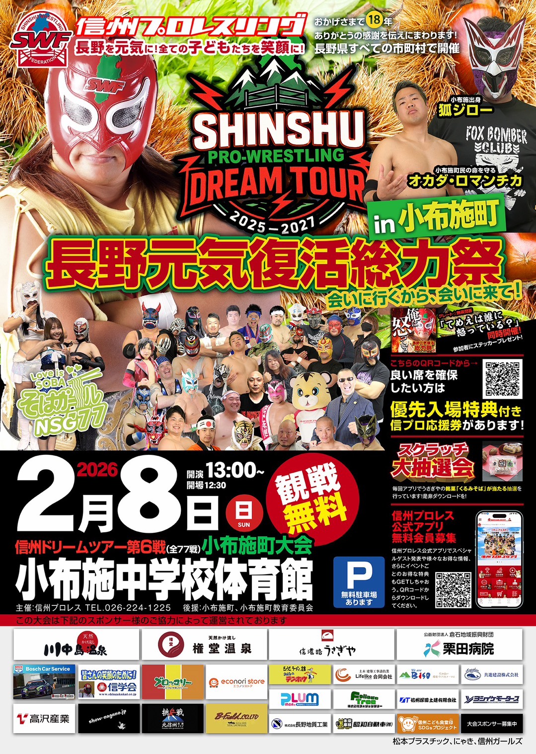 77市町村ドリームツアーin小布施町 最終更新日時 : 信州プロレスリング 【日程】2026年02月08日(日)【時間】13:00開始(12:30開場)【会場】小布施町・小布施中学校体育館 県内全77市町村を巡る「長野県77市町村ドリームツアー2025-2027~元気復活総力祭~」の一つです。 アクセス FacebookXBlueskyHatenaCopy