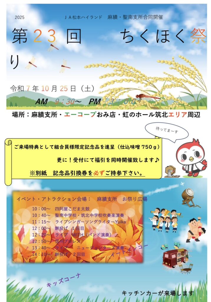 ちくほくまつりマッチ2025 最終更新日時 : 信州プロレスリング 【日程】2025年10月25日(土)【時間】12:50【会場】麻績村・JA松本ハイランド 麻績支所、A・コープ おみ店周辺 ゴムひもマッチを予定。 「第23回ちくほく祭り」内で開催。イベント自体は09:30~15:00の予定で行われます。 対戦カード 12:50開始予定 ・メインイベント タッグマッチ 狐ジロー、 クールポコチ_ VS 信州ビーフオリャー、 タイガーPOLICE アクセス FacebookXBlueskyHatenaCopy