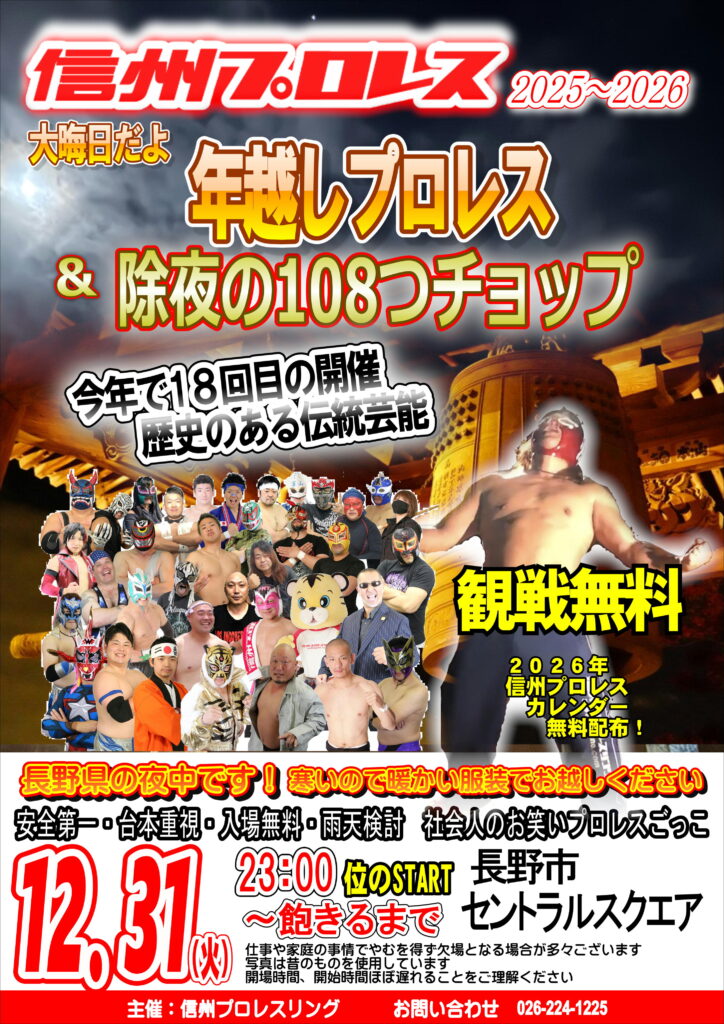2025~2026年越しプロレス 最終更新日時 : 信州プロレスリング 【日程】2025年12月31日(水)【時間】23:00開始【会場】長野市 ながの表参道セントラルスクゥエア ゴムひもマッチを予定。大晦日108つ禊!マッチとなります。 アクセス FacebookXBlueskyHatenaCopy