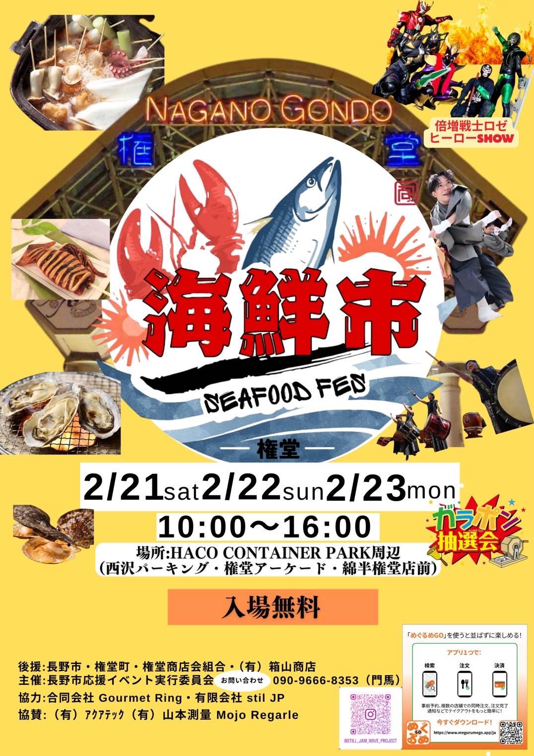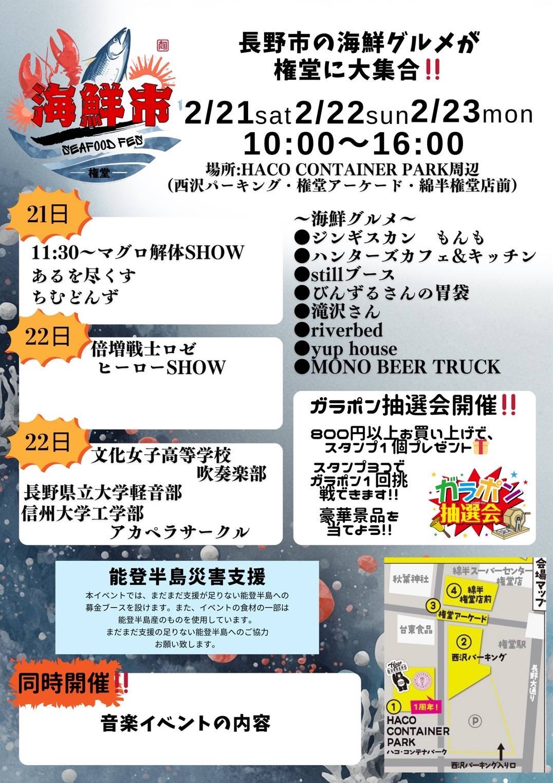 海鮮市マッチ2026 最終更新日時 : 信州プロレスリング 【日程】2026年02月23日(月・祝)【時間】13:00開始予定【会場】長野市・権堂広場 ゴムひもマッチを予定。 イベント自体は21日~23日、終日行われます。 アクセス FacebookXBlueskyHatenaCopy